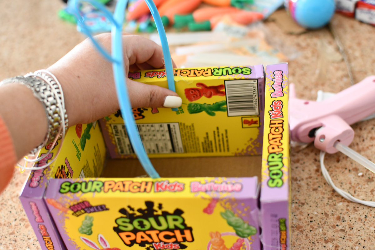 Use a hot glue gun to glue the corners of the candy boxes together, and also glue to a piece of cardboard for the bottom of the basket.