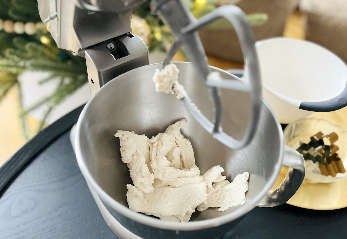 Place your dough into a small bowl and chill in the refrigerator for about 10-15 minutes. This will allow your dough to firm up and be easier to handle when cutting your ornaments.