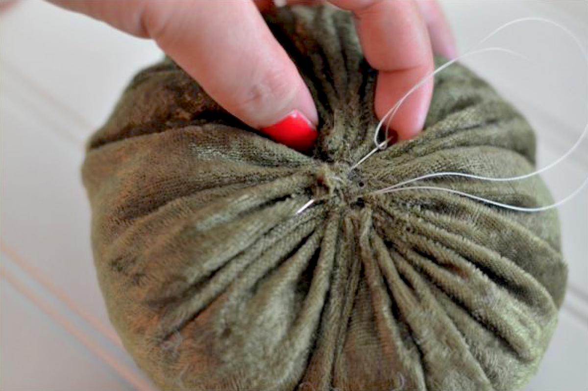 Optional step: On a couple of my smaller velvet pumpkins, I finished by stitching through the top and bottom while pulling tightly. This gives a more realistic, smashed-down look.