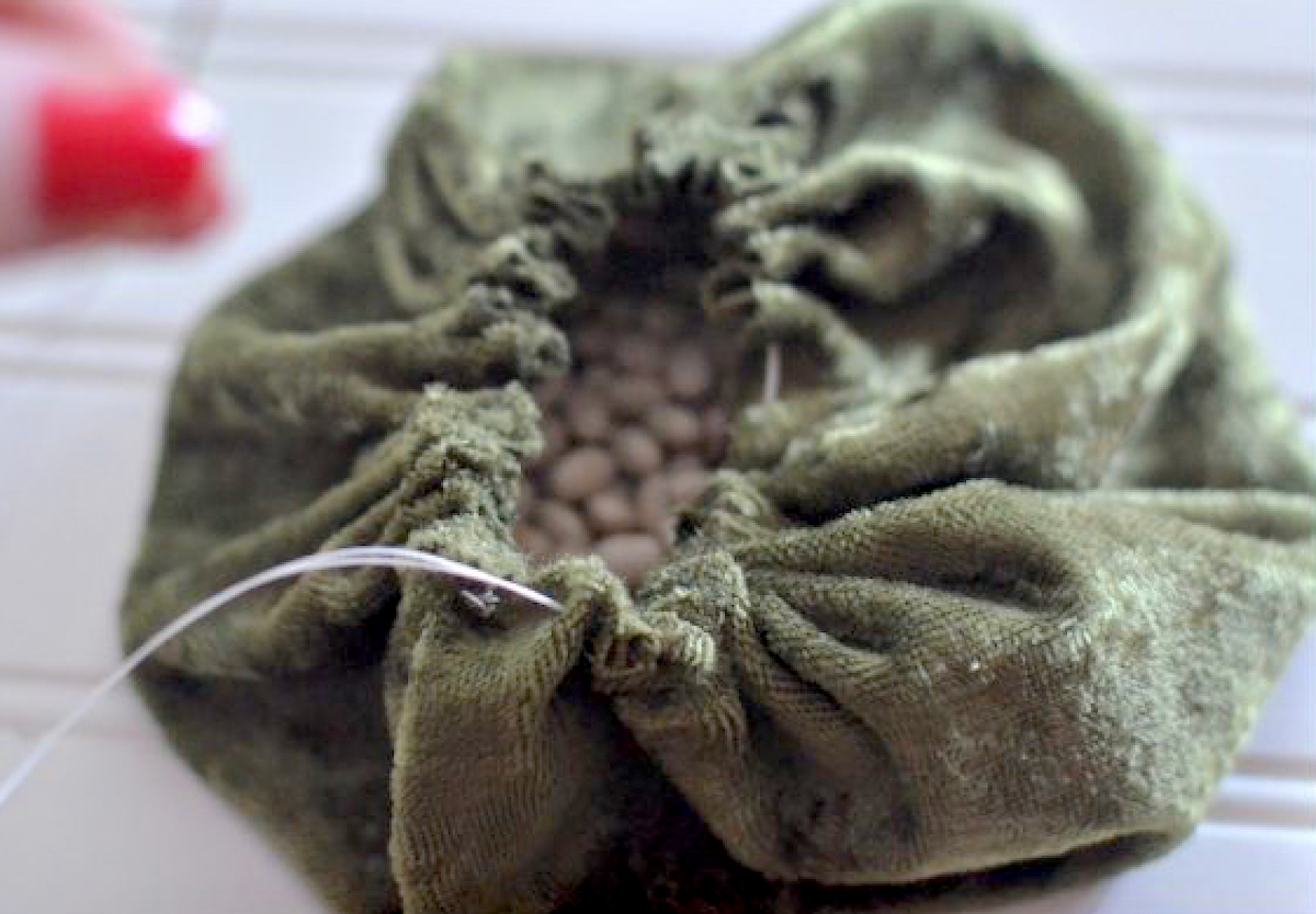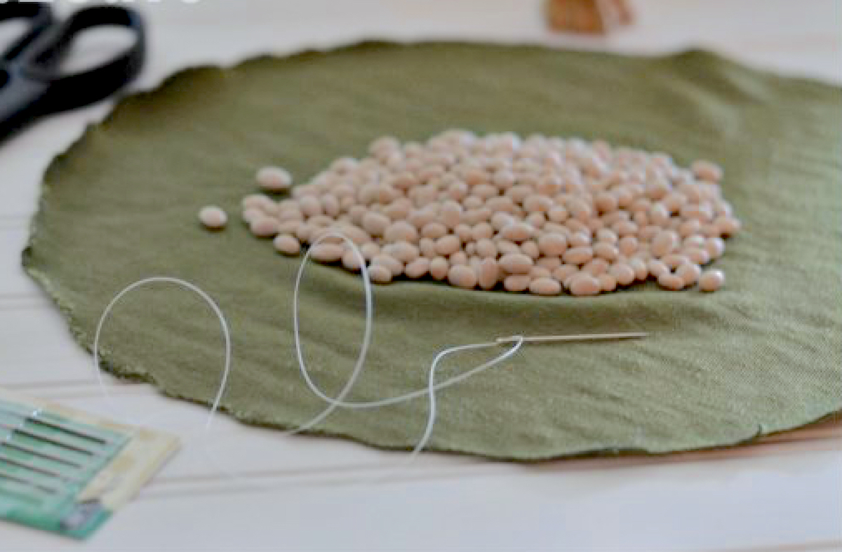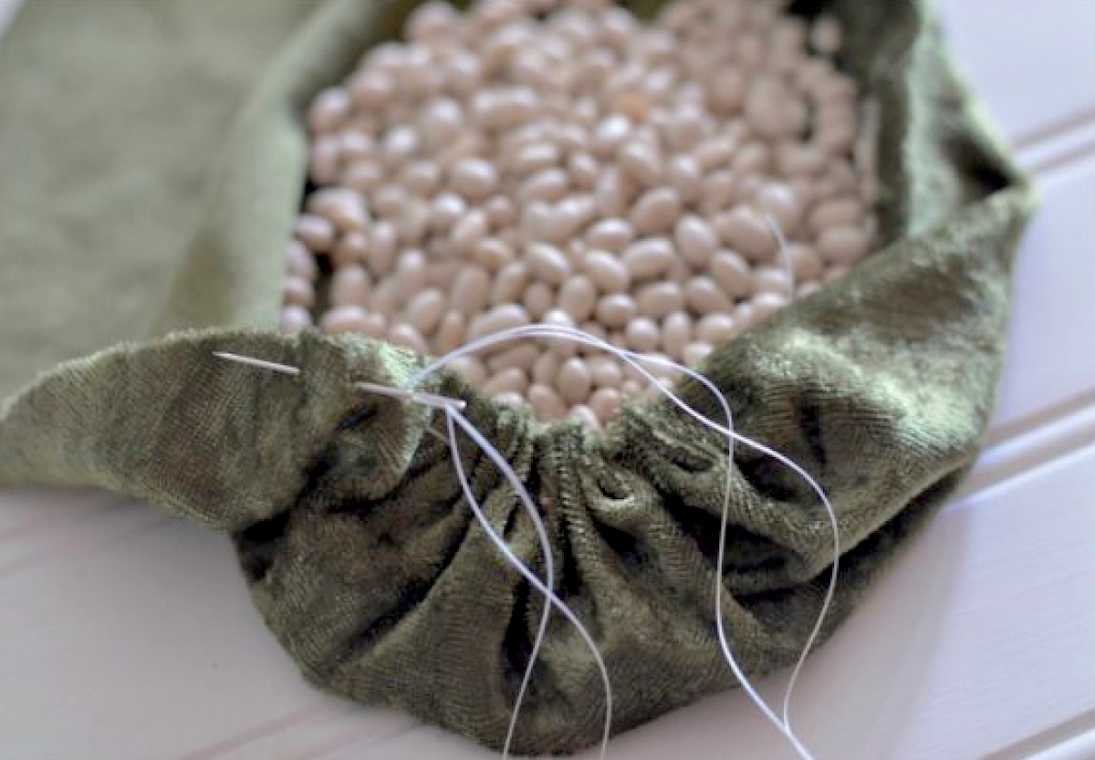 Place the circle with the wrong side of the fabric facing up and sprinkle some beans in the middle. Create a running stitch around the edges of your circle.
