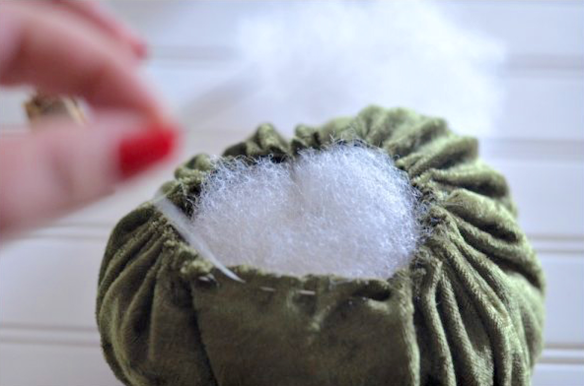 Gently start cinching the edges, but don’t tie off the thread yet. Fill the pumpkin with the desired amount of stuffing.
