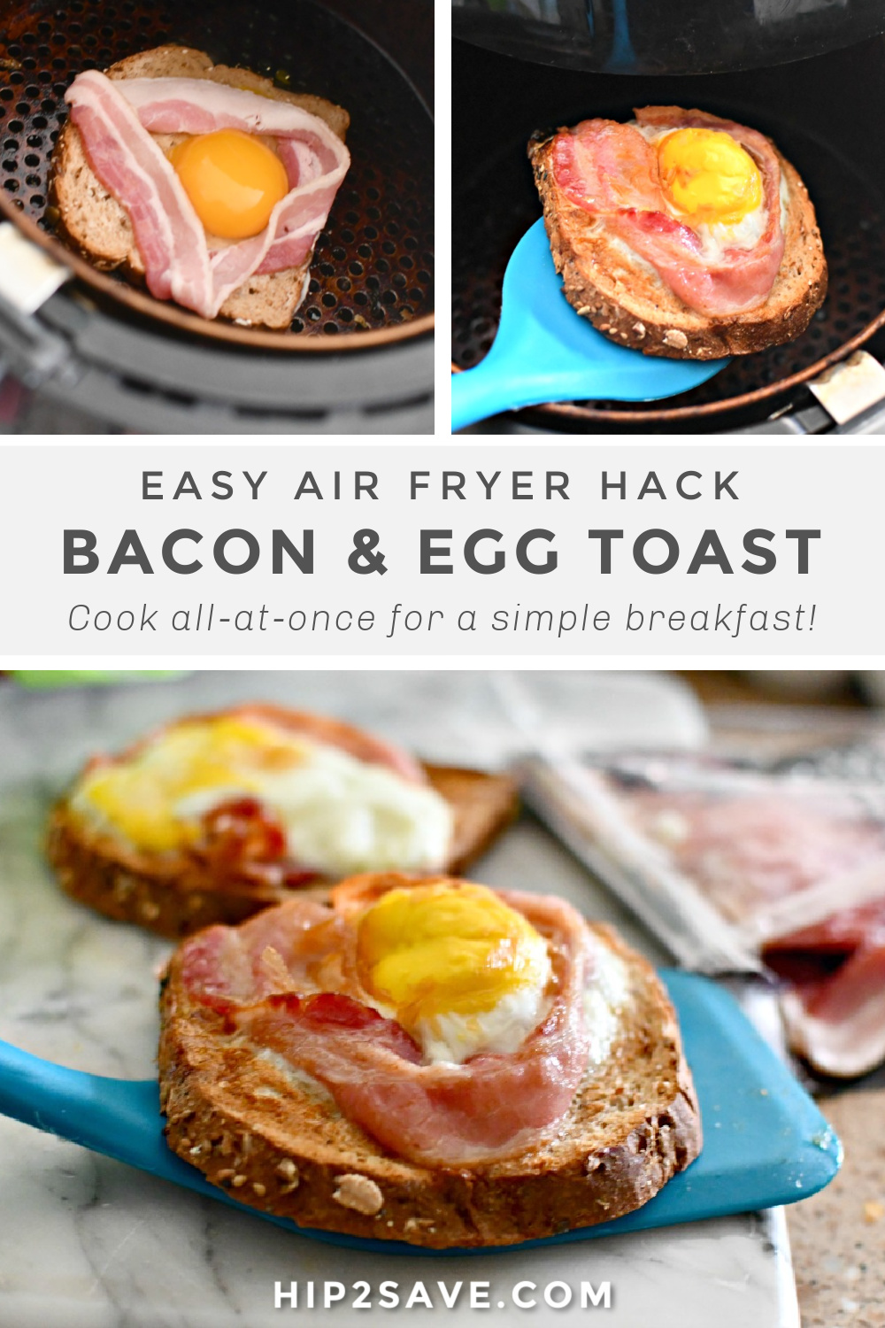 In fact, I recently spotted this cool trick to crack an egg on toast in the air fryer with a slice of bacon to cook them all at the same time! After seeing this Tasty Facebook video, I knew right away it was something genius to try!