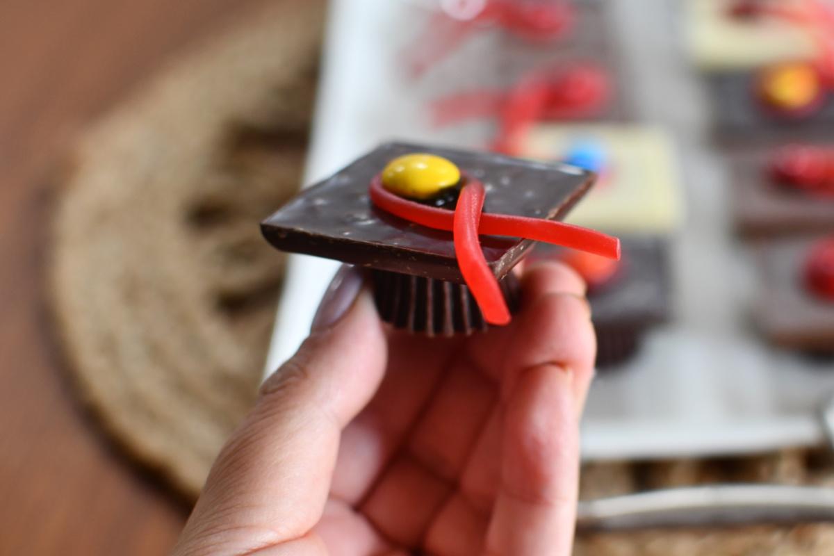 I used various flavors of Ghirardelli chocolate squares for the hats and pull-apart Twizzlers to make a fun tassel. There are different options for candy, so feel free to switch up ingredients if desired. If your graduate has a white graduation cap, consider using the white chocolate squares!