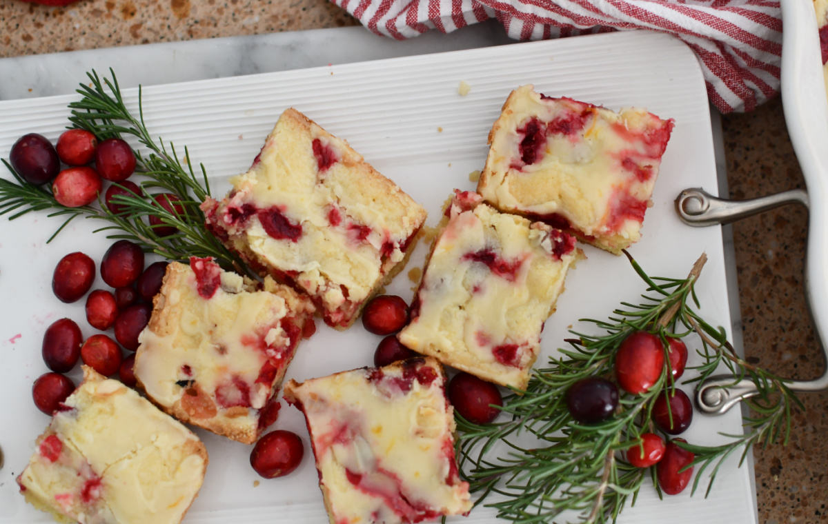 I think the texture is more like a muffin or coffee cake, and it is so delicious served with coffee. The glaze adds an awesome orange flavor. I like to cut up the squares and serve them on a wood tray with fresh rosemary and a few extra cranberries so the presentation is festive.