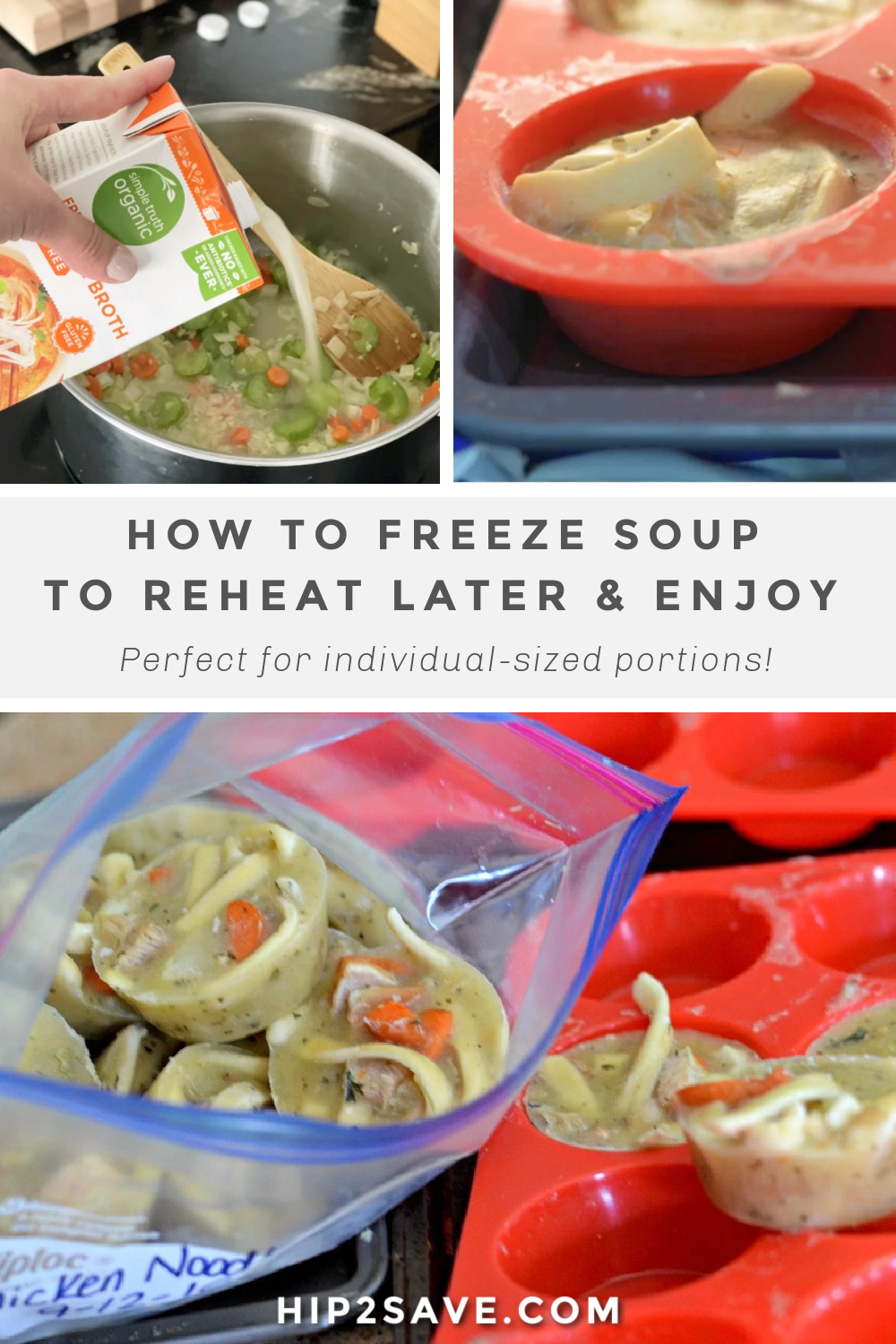 - For soup larger than one serving size, you can use a large Ziplock bag to fill and freeze the soup flat, and then break into pieces before reheating.