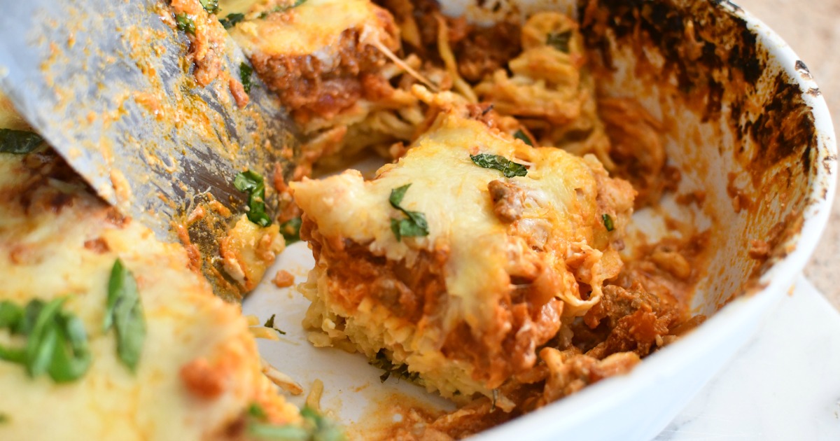 Looking for a dinner idea that everyone will LOVE? This cheesy, gooey, comforting baked million dollar spaghetti will not disappoint! I love how creamy the noodles turn out with the winning combination of meaty marinara sauce and cream cheese, and the top has a cheesy layer of melted mozzarella that’s irresistible.