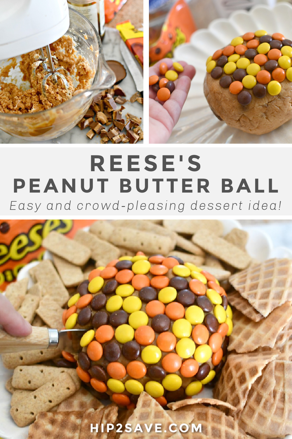 No more wasting leftover Halloween candy! Consider creating a Reese’s Pieces dessert version of the classic cheese ball dip using peanut butter as a fun twist – perfect for parties or any occasion. It’s super easy to make, yet looks so fancy, and makes such a yummy treat!