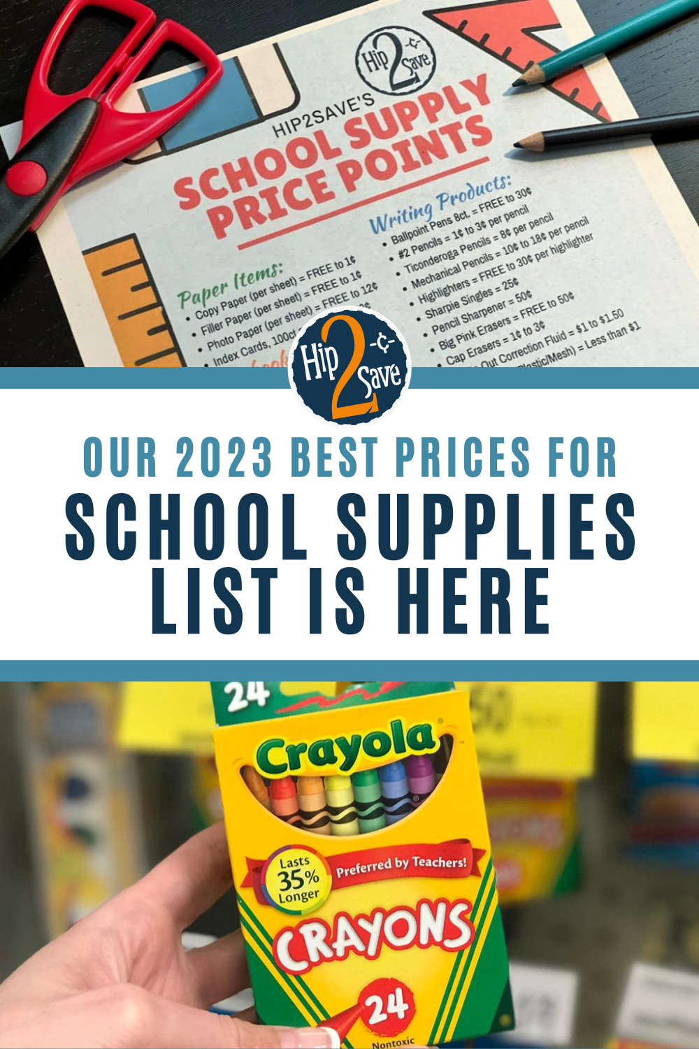 Our free printable Best Prices for School Supplies List shows a range of prices for each item. For example, if you’re looking for crayons, 50¢ is a good price for a 24-count box of Crayola crayons. There’s a chance you may spot them even cheaper, so if you do – STOCK UP!