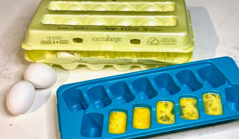 Whisked eggs in an ice cube tray next to egg carton and two eggs on the counter