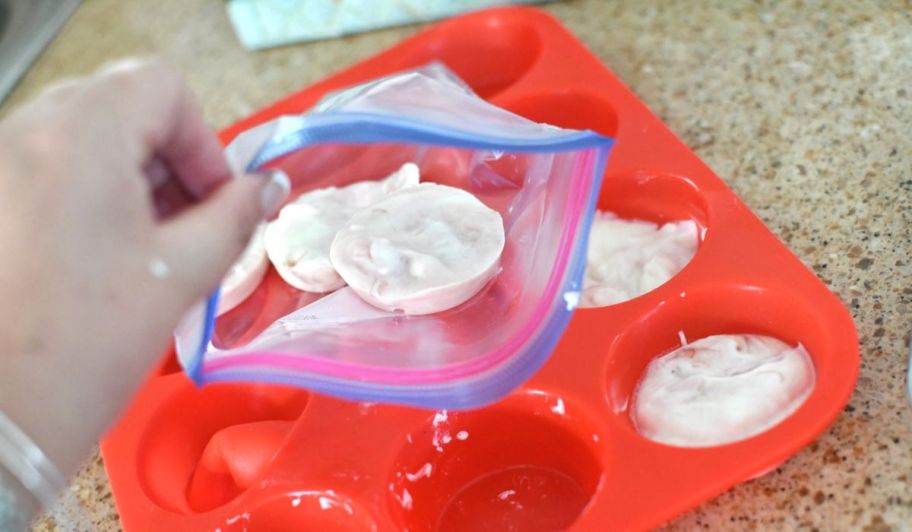 Freezing yogurt dollops in a muffin tin