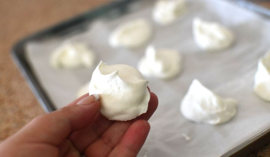 A hand holding a frozen whipped cream dollop