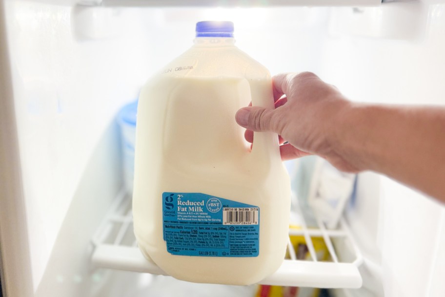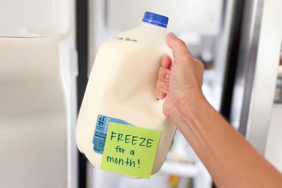 hand holding milk jug in front of freezer