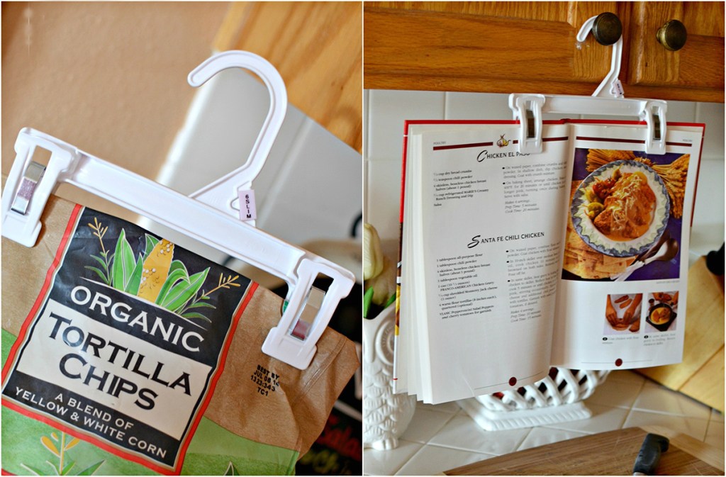 Plastic pant hangers can easily be re-used as chip clips. Consider using one as a clever cookbook holder while making a recipe too!
